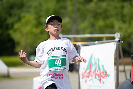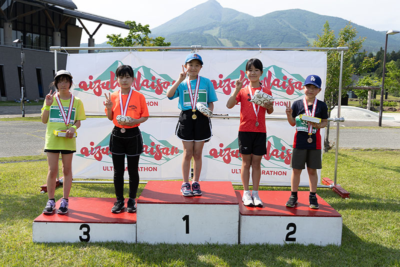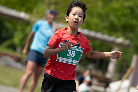 レース前日の6月7日には、初めてキッズトレイルランレースも開催された。レースは小学校1~4年生対象の1kmコースと、このコースを2周走る5・6年生対象の2kmコースがあり、元気いっぱいのキッズたちが会場に集結。スタート後、すぐに林道に入り、猪苗代城址をぐるりと回ってスタート地点に戻ってくるというコースは、アップダウンが続く、なかなかの本格トレイルだ。