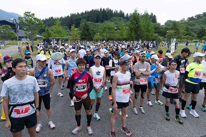 44km部門のスタート地点は、昨年と変わって旧オープス磐梯に。100km部門とは異なり、どこかのんびりとした空気が漂う。この44km部門がスタートしたことで、その後は3部門のランナーが混在して走ることになる。
