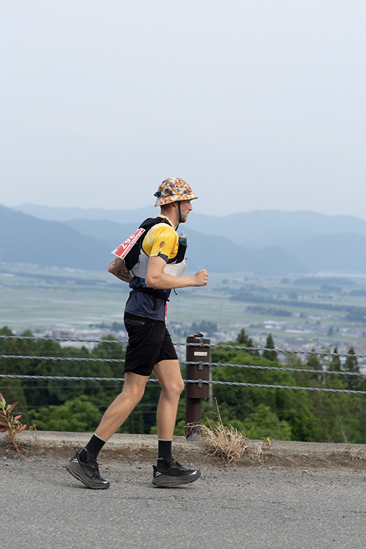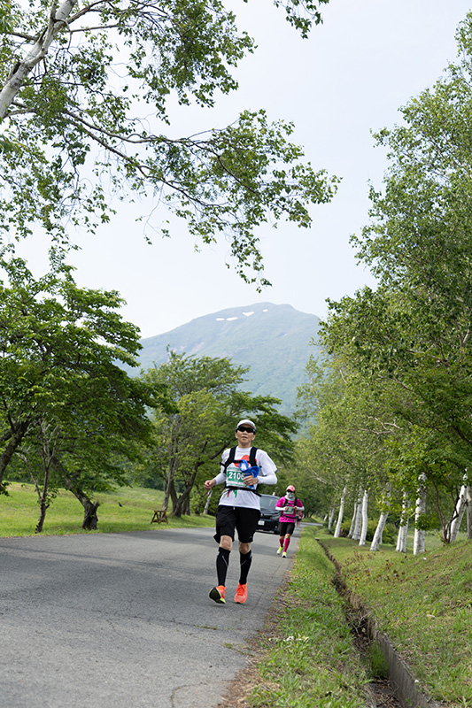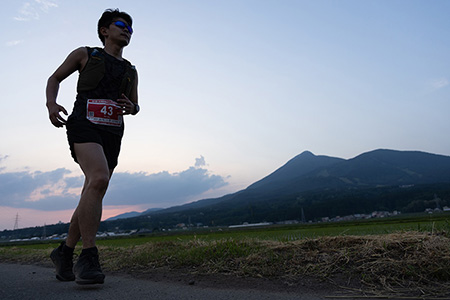 当日、100km部門のスタート地点であるカメリーナ周辺は、ひんやりとした空気に包まれながらも、ランナーの熱気であふれていた。この100km部門の注目は、現在、3連覇中の正岡隼選手が4連覇達成になるかどうか。5時にスタートし、まずは田園地帯を走る。ハイライトのひとつは、磐梯吾妻レークラインと磐梯山ゴールドラインをつなぐコースだ。長い上りに長い下りが続く厳しいコースだが、山頂付近にまだ雪が残る磐梯山に猪苗代湖の美しい風景がランナーの心を癒してくれる。