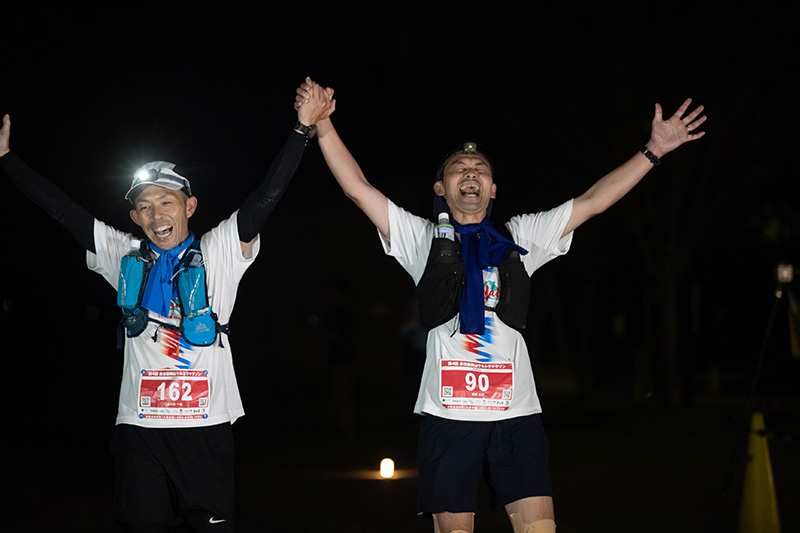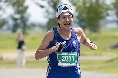 100kmの部トップで入ってきたのは、やはりこの人だった。正岡隼選手、みごと4冠達成。終始、力強い走りを見せていたが、じつはハムストリングを痛め、大会数日前は練習ができないほどだったという。3~40km付近が足が痛くて一番きつかったというが、2位に27分差をつけて、独走態勢でゴールに飛び込んできたのはさすが。昨年に引き続き2位に入ったのは、トップを追わないで自分のぺースで走ったという西原隆之選手。3位には福岡県から来た東勇樹選手が入った。一方、女子1位は、総合でも11位と健闘した加藤志織選手が入った。