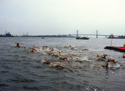 みなとみらいでスイム大会が行われるのは初めて。遠くにベイブリッジを望む