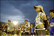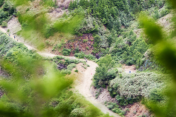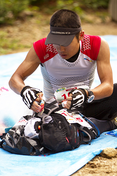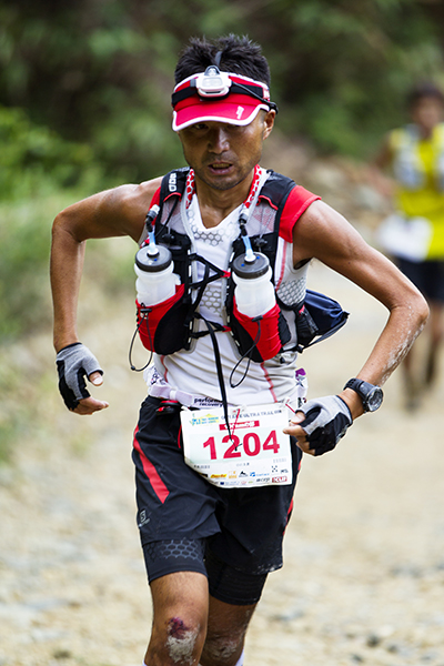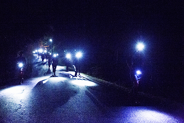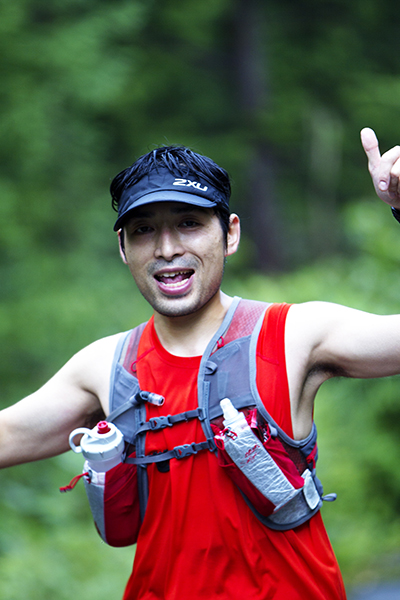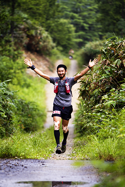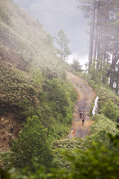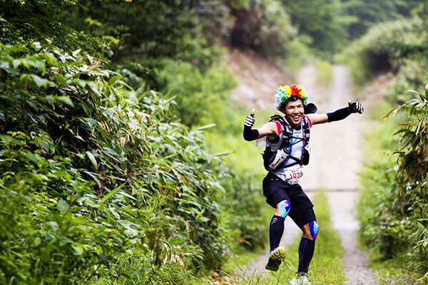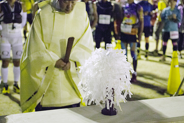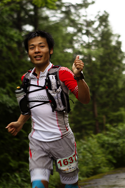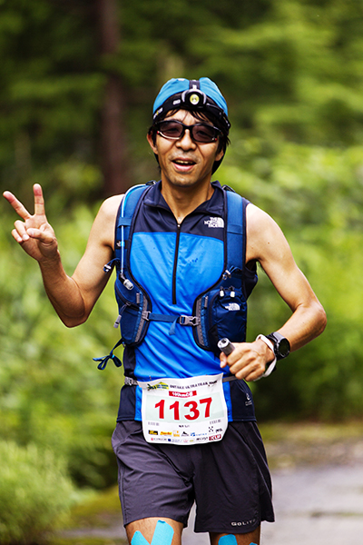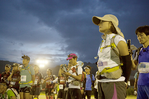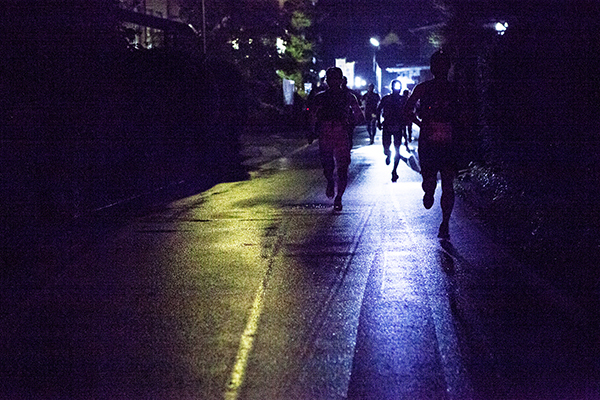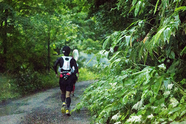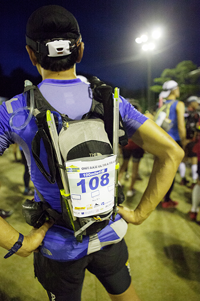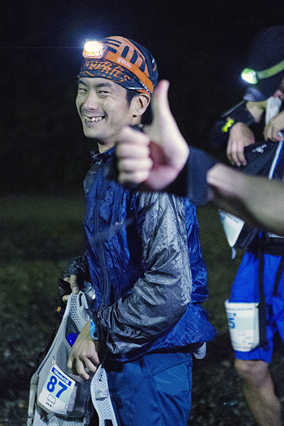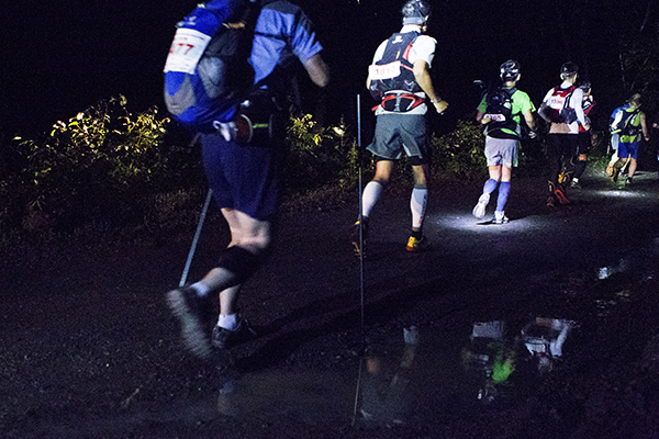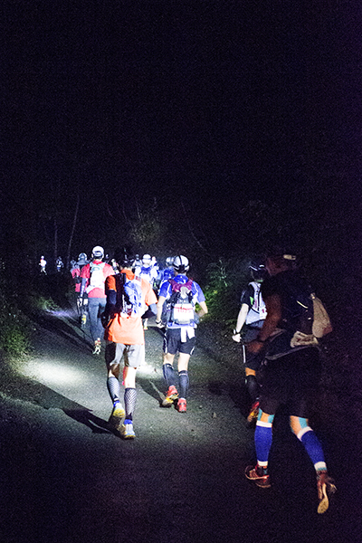 100マイルは午後8時、100キロは午前0時にスタートする今大会。100マイルのスタート後には雨が土砂降りにかとおもいきやすぐに止む。このような繰り返しの天候の中制限時間24時間以内のゴールをめざしランナーが限界まで挑戦しました。遠くからヘッドライトの明かりが見えてくる姿は蛍のようで、集団のランナーが来ること、とても幻想的な光景でした。スタートして5時間後には朝焼けが始まります。今年はぎりぎり太陽も見えたようで選手の気持ちも上昇したのではないでしょうか。