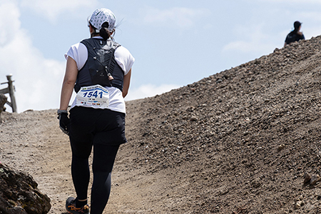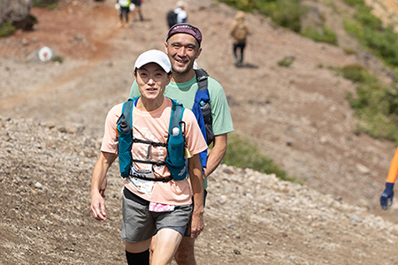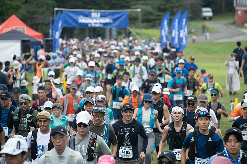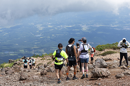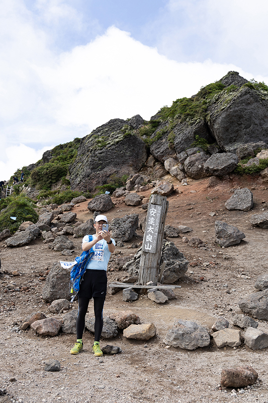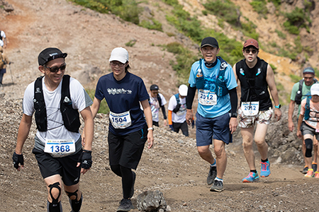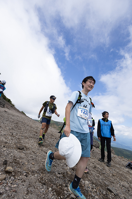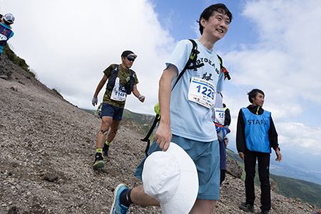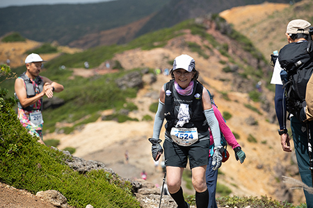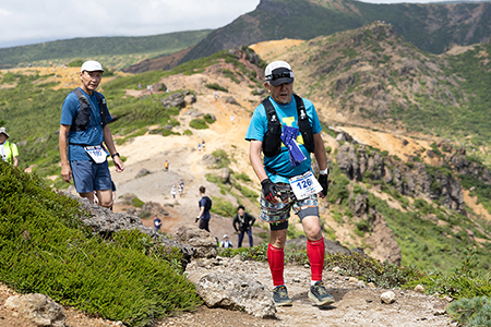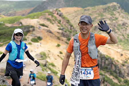 日本百名山のひとつに数えられている東北の名峰、安達太良山(標高1700m)。ここを往復するのが、14Kのコースだ。翌日行われる難易度の高い50Kに対して、14Kの完走率は例年ほぼ100%で、ビギナー向けの大会といわれる。そんな参加しやすい大会ゆえか、今回は10代から80代と幅広い年代からご参加いただいた。