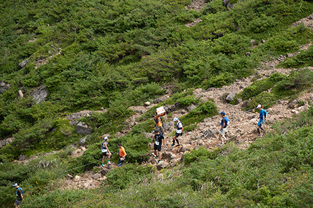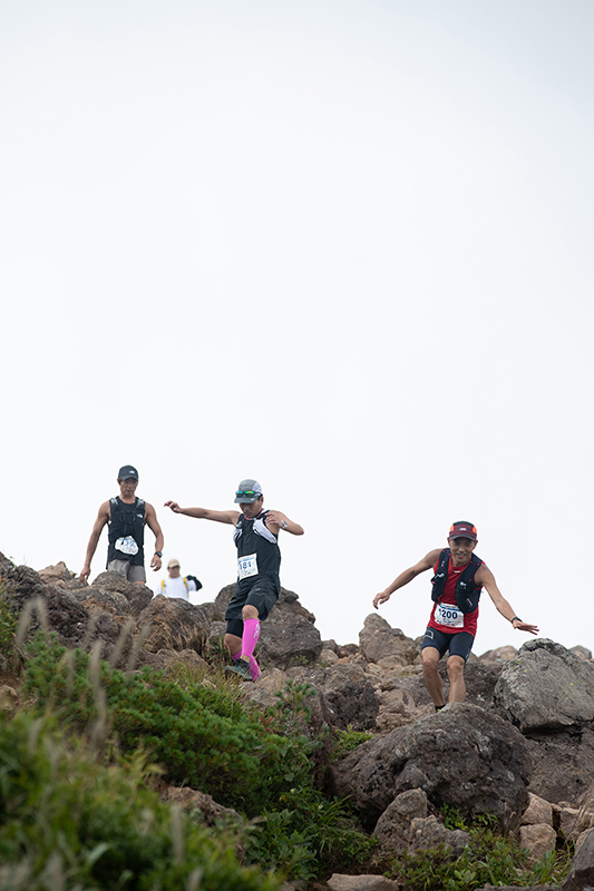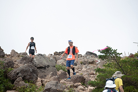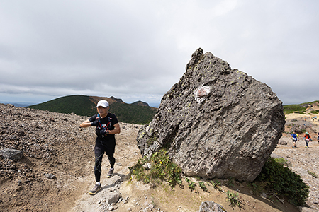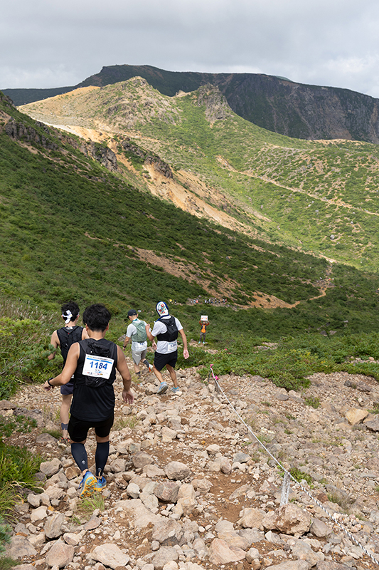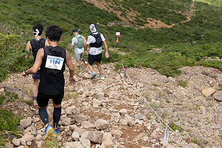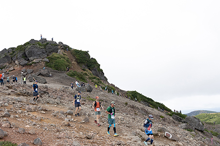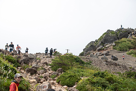 スタート直後、すぐに林道に入る。狭い道なので、渋滞は必須。この林道を抜けると岩場に出る。ここを上り切ると前方が開け、正面に安達太良山が見えてくる。心が晴れるような、この時の気持ちよさは走った者にしかわからない。荒々しい景観の山頂付近は歩行区間となっているが、ここは周囲の山々を堪能する区間ととらえて、必ず歩いて進もう。