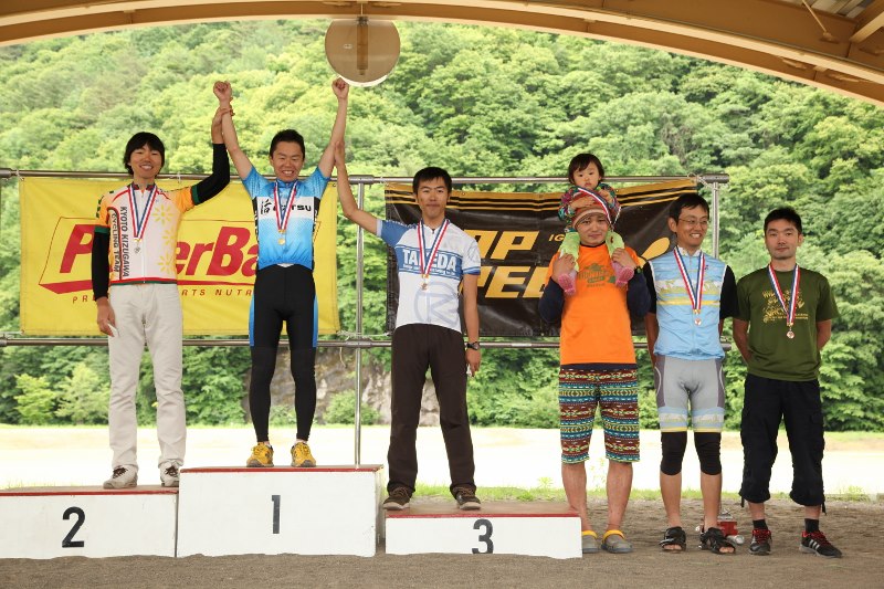 選手が登りきったところでペースカーを先頭にみんなでゆっくり下山。松原スポーツ公園まで戻ってきた後は表彰式を行いました。協賛各社から豪華賞品を提供していただきました。